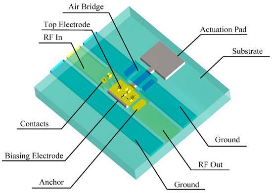 RF MEMS switches have superior RF performance in terms of insertion loss, isolation, power handling, and linearity over other RF switching devices [10]. To date, past advances in metal-to-metal contact MEMS switches have made the monolithic fabrication of high-quality switched-wire true-time delay (TTD) networks a relatively easy task. The structure diagram of the RF MEMS switch is shown in Figure 1.