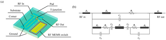 is the equivalent impedance of the coplanar waveguide (CPW), is the contact resistance between the upper electrode and the CPW signal line, is the coupling capacitance at the input and output ends of the CPW signal line, is the characteristic impedance of the upper electrode section of the RF MEMS switch, is the grounding capacitance between the air bridge membrane structure and the lower signal line, and is the equivalent impedance of the transmission line, which contributes the group delay.