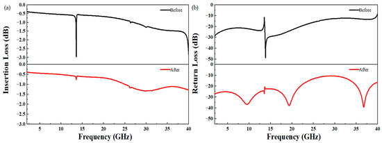 By adding the inductance matching section and corner transition structure and introducing an air bridge, the insertion loss and return loss of the TTDL unit can be greatly improved, as shown in Figure 4a,b, respectively.