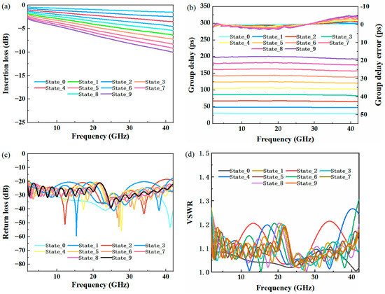 Figure 6a–d show the simulation results for the IL(S21), group delay, group delay error, RL(S11), and VSWR of the TTDL network, respectively. When upper switches 1~9 are closed and other switches are disconnected, it represents the start bit of the TTDL network, and the group delay is 30.01 ps. When switch 1 is off, and upper switches 2~9 and lower switches 1′~9″ are closed, it means that the first bit is enabled, the group delay is 48.04 ps, and the step is 18 ps. By analogy, from the second to ninth bits, the TTDL network has ten delay states, realizing a nine-bit controllable group delay from 30 ps to 200 ps, and the interval is 18 ps.