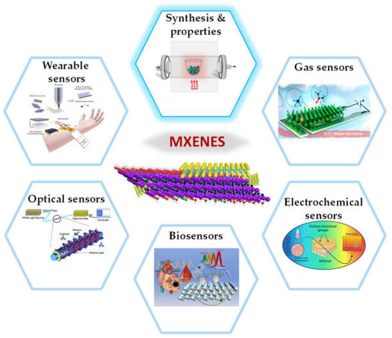 An overview of the applications of MXenes in the sensor, including gas sensors, electrochemical sensors, biosensors, optical sensors, wearable sensors, and synthesis & properties.