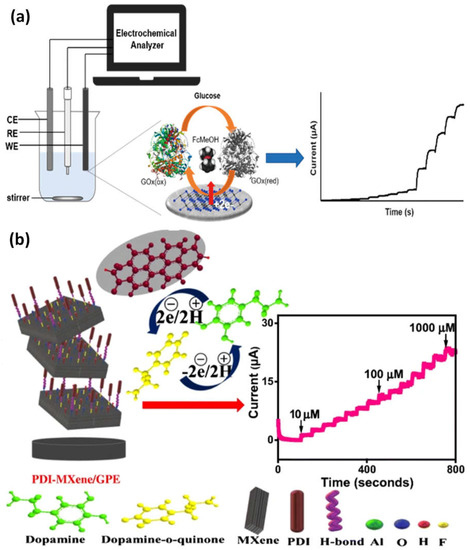 (a) An example of a diagram showing how the electrochemical glucose sensor functions; (b) a graphitic pencil electrode with perylene diimide-MXene integration for the electrochemical sensing of dopamine and amperometric current-time response curves for the gradual addition of various concentrations of dopamine solution. Reproduced with permission from references [75,76].