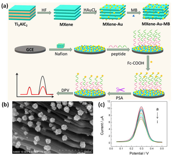 High conductivity was demonstrated by the nanomaterial made of MXene loaded with MB and AuNPs (MXene-Au-MB). Biomolecules with sulfhydryl termini might be captured by AuNPs, and the MB molecules could then be utilized to provide an electrochemical signal. To create a biosensor, the carboxyl-modified ferrocene (Fc) electrochemical signal sensor was collected by the anchored peptide after the MXene-Au-MB was secured by nafion from the electrode surface. The multifunctional peptide gave the sensing surface the capacity to withstand non-specific adsorption from complicated samples in addition to providing the assaying function. It also contained the antifouling, anchoring, and recognition sequences. The signal of MB in the biosensor system stayed constant as the target concentration increased, whereas the electrochemical signal of Fc steadily declined. The ratiometric detection technique considerably increased the biosensor’s accuracy (Figure 8a–c). The recognizing sequence was identified and cleaved in the presence of a prostate-specific antigen (PSA), model target, and the ratiometric signal of Fc and MB precisely and sensitively identified the intensity of PSA, with a detection ranging from 5–10 ng/mL and a detection limit of 0.83 pg/mL [86].