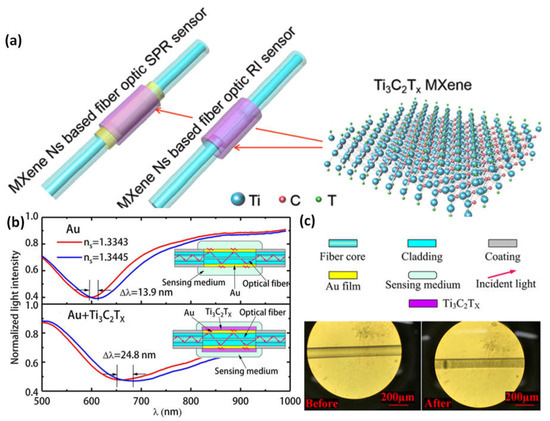 (a) 2D MXene Ti3C2Tx improves the sensitivity of optical fiber nanosensors, including RI and SPR sensors; (b) differences in the standardized intensity of light to wavelength for the traditional fiber optic surface plasmon resonance (SPR) nanosensor of Au film and the optical sensor with the MXene layer; (c) The graphs of an optical fiber RI detector before and after the MXene Ns modification. Reproduced with permission from reference [93].