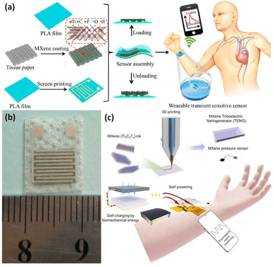 (a) Sandwiching a thin sheet of a biodegradable polylactic acid (PLA) and an interdigitated electrode-coated PLA between two porous MXene-impregnated tissue papers to anticipate the potential health condition of patients and serve as a tactile input mapping electronic skin; (b) images of the stretchable transient pressure sensor for wearables; (c) the suggested, designed, characterized, and verified wearable device for MXene-based, adaptable, and integrated physiological biosignals monitoring for continuous, real-time. Reproduced with permission from references [101,102].