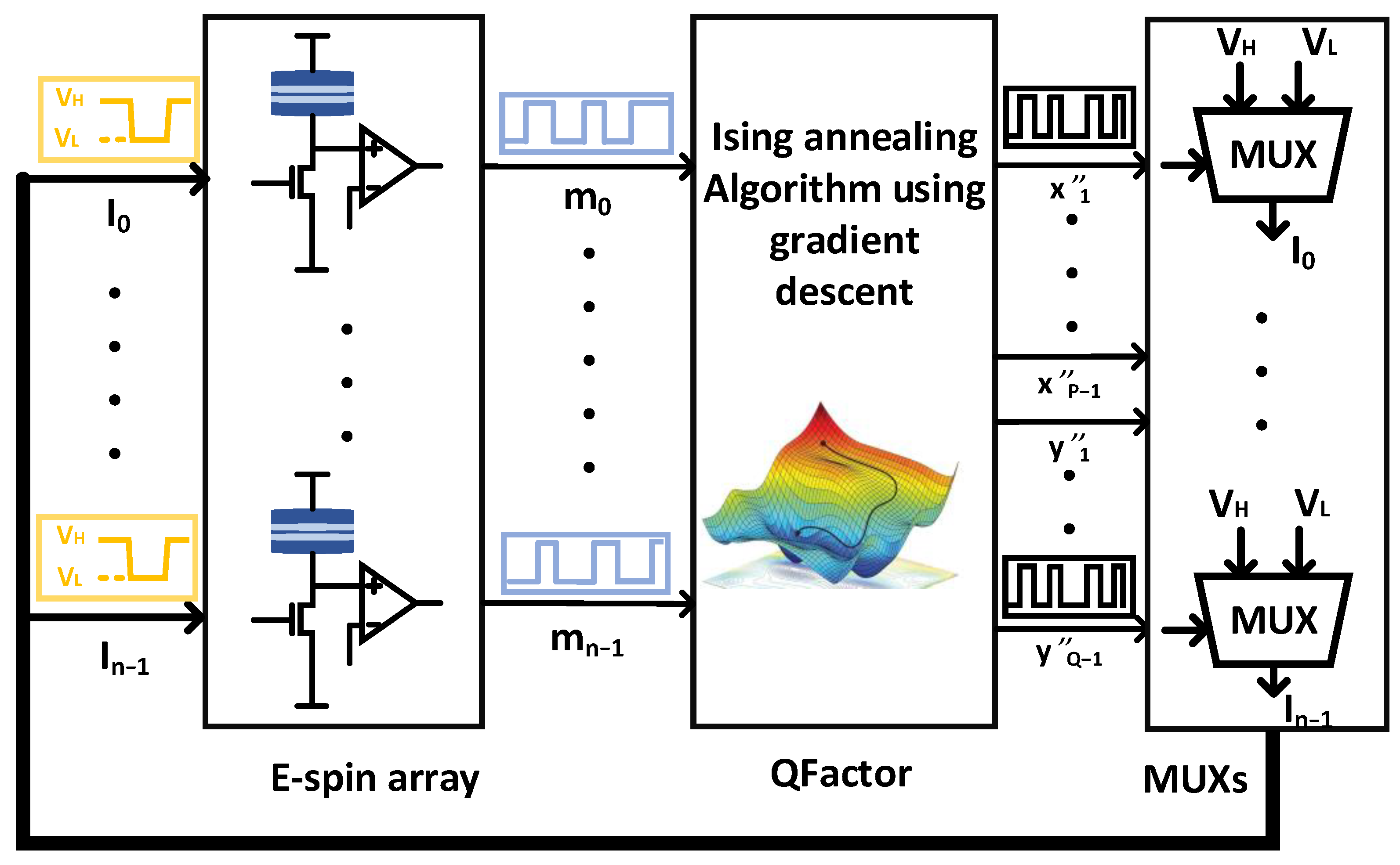 - If the calculated or equals value “1”, the MUX outputs to the corresponding . Then, the E-spin provides a strong likelihood of an output value “1”. The is the parameter that can be adjusted. In this experiment, we set to be around 0.95 V and to be 0.55 V. The random flips of E-spin do not frequently occur, so the gradient descent procedure is dominant in most cases.