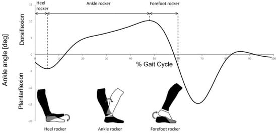 Graphical representation of the heel, ankle, and forefoot rockers within the stance phase (0–60% of the gait cycle). The heel rocker corresponds to the plantarflexion movement of the ankle at the beginning of the stance phase. The ankle rocker corresponds to the dorsiflexion movement during the most part of the stance phase. The forefoot rocker corresponds to the plantarflexion movement at the end of the stance phase.