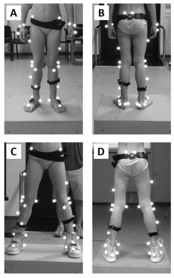 A seven infrared camera motion capture system (MTx, Vicon, Oxford, UK, sampling rate: 100 samples/s) was used to measure gait kinematics and to segment the gait cycle. A total of 14 markers were placed on the child for static and dynamic trials according to the Plug-in Gait lower-body model [32] (Figure 2). The textile design of the shoe used in combination with the orthosis allowed for palpation of anatomical landmarks, except for the one on the heel. This marker was identified as the most posterior point of the posterior profile of the shoe.