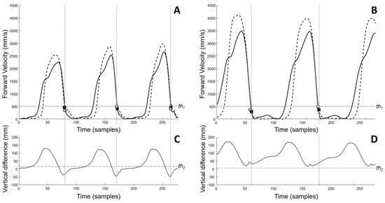 Top (A,B): Forward velocity of HEE (continuous thick black line) and TOE (dashed thick black line) for two trials representative of heel (left) and toe strike (right); horizontal thin continuous black line: th1. The white circles and black squares correspond to when the forward velocities of HEE and TOE fall below th1, respectively. Bottom (C,D): Difference of HEE and TOE vertical components (thick continuous grey line); horizontal thin dot−dashed grey line: th2. Depending on the value of this difference (below or above th2) a heel or toe FS was identified. For heel FS when HEE and TOE forward velocity fell below th1 (panel A), the difference between HEE and TOE vertical components was less than th2 (panel C); the HEE marker (white circles in panel A) was chosen as reference to identify FS. For toe FS when HEE and TOE forward velocity fell below th1 (panel B), the difference between HEE and TOE vertical components was greater than th2 (panel D); thus, the TOE marker (black squares in panel B) was chosen as reference to identify FS.