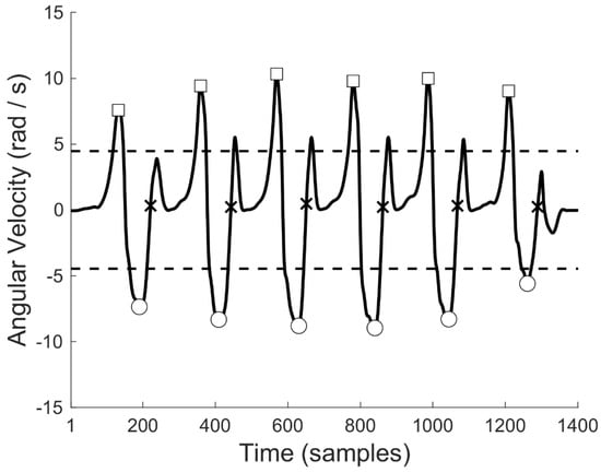 Medial-lateral angular velocity of the foot-mounted IMU for a linear gait representative of the population (continuous line); the circles are the local minima with a magnitude bigger than the signal standard deviation (below dashed line); FSs (crosses) are identified as the first ascending zero-crossing time sample after each of the local minima, roughly coinciding with the mid-swing phase of the gait cycle; FOs (squares) are the local maxima preceding the mid−swing local minima and bigger than the signal standard deviation (above dashed line).