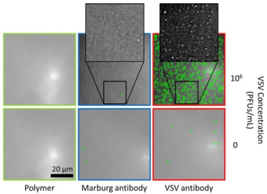 Daaboul and coworkers took the SP-IRIS technique one step further and demonstrated the success of SP-IRIS in detecting multiple viruses from highly bacteria-contaminated complex samples (serum or whole blood) []. The thickness of Si-SiO2 substrate is optimized for imaging viruses and nanoparticles with sizes in the range of 60–200 nm. The layered sensor surface was designed in a microarray format with antibodies specifically recognized the glycoproteins of VSV, Ebola (EBOV) and Marburg virus (MARV). Ebola and Marburg glycoproteins were obtained by inserting related gene region with pAK vector into the VSV genome where the VSV glycoprotein-encoded sequence was deducted. The results were seen to be correlated when the responses obtained for samples containing individual pseudo type viruses (EBOV and MARV) were compared with those obtained for the sample in which the two viruses were co-existing. The limit of detection was recorded as 5 × 103 PFU/mL for EBOV and MARV in both the mixed and single virus existed whole blood samples spiked with 106 colony forming units/mL (CFU/mL) of E. coli K12 to increase the sample complexity (Figure 3).