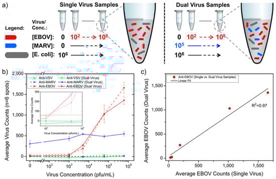 Dual detection of pseudotyped EBOV and MARV from fetal bovine serum contaminated with E. coli K12 at the concentration of 106 CFU/mL. Scheme of (a) preparation of single and dual virus spiked samples; (b) the results obtained for single virus detection and dual detection at different virus concentrations; (c) the response obtained with anti-Ebola spots for FBS and bacteria spiked FBS samples was similar, as indicated by the linear regression fitting the scatter plot of one sample type versus the other []. Reproduced with permission from G.G. Daaboul, C.A. Lopez, J. Chinnala, B.B. Goldberg, J.H. Connor, M.S. Ünlü, ACS Nano; Published by American Chemical Society, 2014.