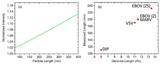 Discrimination of viruses with genome length. (a) The sizing curve that was composed with the responses obtained for varying lengths of a cylindrical particle with constant width, was used to calculate the dimension of virus particles based on VSV captured on the SP-IRIS chip surface. (b) The virus lengths measured with SP-IRIS for wtVSV, DIP, MARV, EBOV (Z), EBOV (ZS) []. Reproduced with permission from G.G. Daaboul, C.A. Lopez, J. Chinnala, B.B. Goldberg, J.H. Connor, M.S. Ünlü, ACS Nano; Published by American Chemical Society, 2014.