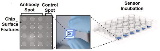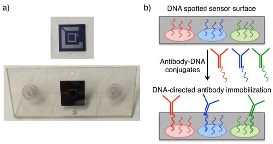 Protein microarray-based detection approaches have gained attention for biomedical applications such as pathogen or biomarker detection, drug development and screening [,]. However, some limitations may be encountered in the immobilization of proteins to the array surface depending on surface chemistry. While capturing antibodies to the surface, multiple covalent bindings that can be occurred between antibody and the surface, are causing activity lose by blocking antigen binding sides of the antibody [,]. Additionally, steric hindrance between antibody-surface and antibody-antibody may affect activity. These challenges have led researchers to investigate alternative protein binding methods in order to enhance sensitivity of assays []. Seymour and coworkers utilized a DNA associated probe immobilization technique that combines the advantages of DNA microarray with diagnostic benefit of proteins by using DNA conjugated antibodies []. Thus, DNA conjugated antibodies were immobilized onto the chip with their complementary ssDNA probes instead of forming antibody array on the sensor chip surface (Figure 5).