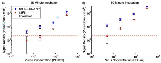 Owing to the advantages of this method, such as increasing the capacity of antigen binding [], providing homogeneous distribution of the probes [], and enhancing the reproducibility of the assay [], they have improved the existed SP-IRIS technology by creating a versatile and robust sensing platform. DNAs conjugated to antibodies acting as spacer arms, allowing antibodies to rise on the polymeric surface. Due to the reduced steric hindrance depending on the elevation of antibodies, capturing efficiency of antigenic substances was enhanced. Firstly, they optimized the length of DNA probes immobilized on the polymeric surface by utilizing spectral self-interference fluorescents microscope (SSFM) in order to develop high-throughput virus sensing platform. To compare the efficacy of DNA conjugated antibody binding with direct antibody binding, genetically modified VSV (containing the gene encoding the Ebola glycoprotein) was used as the model virus. DNA sequences named as A and B were used to conjugate monoclonal 8G5 (anti-wtVSV) and monoclonal 13F6 (anti-EBOV pseudotyped VSV), respectively. On the other hand, the same antibodies were spotted on the polymeric surface without DNA linkers. As a result of the study, it was seen that after 15 min incubation LOD was determined as 500 PFU/mL for DNA conjugated 13F6 whereas 8000 PFU/mL for directly immobilized antibody. Thanks to the increased capture efficiency, sensitive and specific virus detection has been acquired even in a short incubation time (Figure 6).