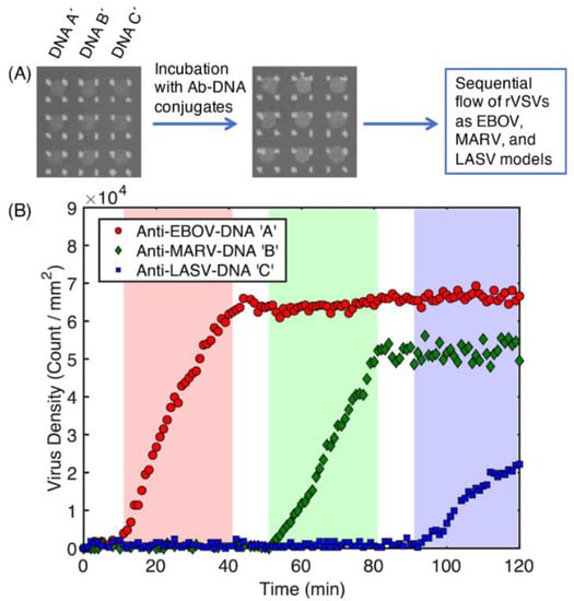 After the optimization of DNA-based constitution of chip surface, this method was used for multiplex virus detection []. VSV-pseudotyped Ebola, Marburg and Lassa virus specific antibodies (anti-EBOV, anti-MARV, anti-LASV) conjugated with ssDNAs were immobilized on the chip surface decorated with complementary ssDNAs. After antibody immobilization, virus samples were sequentially passed through the microfluidic cartridge with the following order; VSV-EBOV, VSV-MARV and VSV-LASV. When each virus was flowed through the cartridge for 30 min, signal increase was seen in its specific antibody spots. An increase in virus densities was measured with SP-IRIS during experiment (Figure 7). DNA conjugated antibody immobilization was proved as an effective method for designing multiplexed antibody array. Moreover, antibody sets can be changed to detect different targets during the need with this programmable DNA-based chip surface.