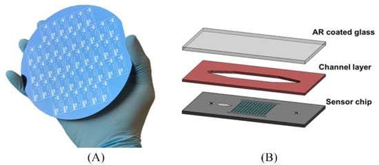 Schematic representation of new generation. (A) IRIS chip; (B) Si-based IRIS cartridge []. Reproduced with permission from A.Y. Ozkumur, F.E. Kanik, J.T. Trueb, C. Yurdakul, M.S. Ünlü, IEEE Journal of Selected Topics in Quantum Electronics; Published by IEEE, 2019.