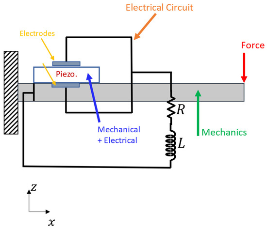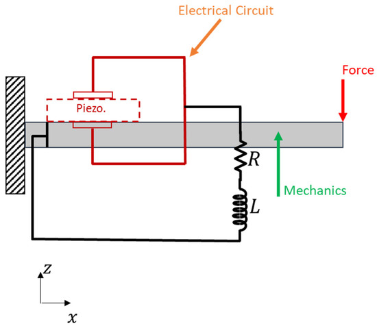 From these two sets of coupled Equations (3) and (4), the first set describes the equilibrium condition of the mechanical forces and the second set is an electrodynamics condition of the electric potential. These two sets of equations can be employed to derive the piezoelectric passive damping force by means of shunt damping circuits connected to the piezoelectric electrodes. In more detail, after obtaining the appropriate design of the electric part, the solution of Equation (4) for and the combination of the find part (3) leads to the description of the system in the form of a modified mechanical system that includes the effect of the shunted circuit.