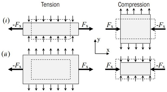 Mechanical behavior applying a tensile and compressive load—(i) non-auxetic material and (ii) auxetic material. Reproduced from source [27] under CC-BY licence.