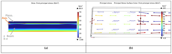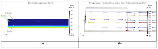 In order to demonstrate the function of the auxetic layer, plots of the stresses within the patch for a positive and negative Poisson’s ratio are compared, and this explains the function of the previously described mechanism; see the stress distribution within a cross-section of the beam in Figure 4 and Figure 5, respectively. The different stress distribution is due to the ability of the auxetic layer to transform a tension–compression signal from the surface of the host beam to a tension–tension one on the surface of the piezoelectric patch. It must be noted that the usage of 3D modeling is necessary for the study of this effect, which is invisible in 2D models.