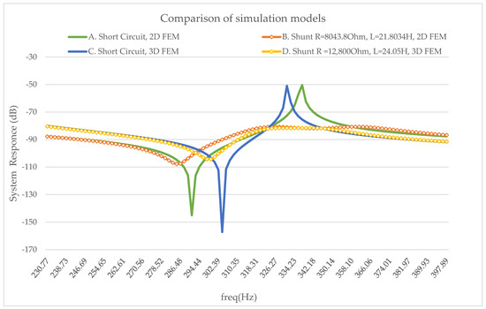 Simulated frequency response of the two models. Aluminum beam, Piezo. PIC151 and Optimal RL circuit values. A. Short circuit 2D FEM MATLAB, B. Shunt circuit R = 8043.8 Ohm L = 21.8034H 2D FEM MATLAB, C. Short circuit 3D FEM, D. Shunt circuit R = 12,800 Ohm L = 24.05 H 3D FEM.