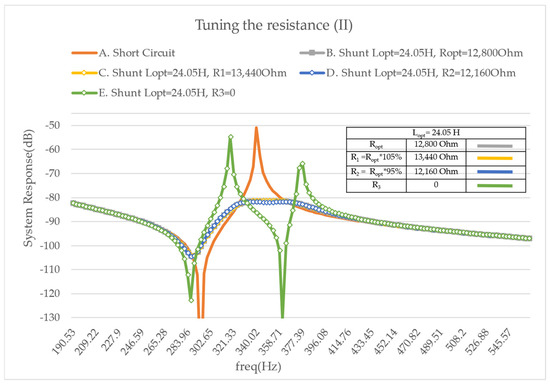 First, resistance is added into the shunt in order to obtain a vibration reduction over a broader frequency range. Based on the literature, the optimal resistance leads to a significant reduction in the vibration when compared to the cases involving a short-circuited PZT or a purely inductive shunt. Then, the optimal tuning of the resonant shunt can be validated. The influence of the resistance R is illustrated in Figure 7 when the inductance L is tuned to its optimal value. It is noticed that if one doubles the value of optimal resistance two local maxima appear, whose value increases with the increase in the resistance. On the contrary, half of the optimal resistance leads to a local minimum surrounded by two local maxima that offer approximately the same value. Then, the optimal tuning then corresponds to a case where two maxima appear, but their amplitude is minimized. In the following chart (Figure 7), this optimal damping corresponds to the limit between the so-called under- and overdamped cases.
