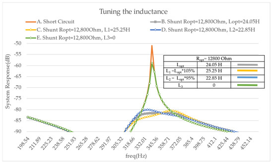 Furthermore, the tuning of the inductance is shown in Figure 9, where the resistance is set to its optimal value. According to the literature, the use of an inductance value that differs from the mathematic equation increases the amplitude of one of the two maxima. Thus, the different values of the inductance are investigated and this effect can be observed in Figure 9.
