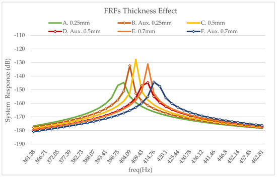Simulated frequency response for the second eigenmode. Aluminum beam, Piezo. PIC151, additional layer hA and open circuit- A. vxy = 0.202 hA = 0.25 mm, B. vxy = —0.202 hA = 0.25 mm, C. vxy = 0.202 hA = 0.5 mm, D. vxy = —0.202 hA = 0.5 mm, E. vxy = 0.202 hA = 0.7 mm, F. vxy = —0.202 hA = 0.7 mm.