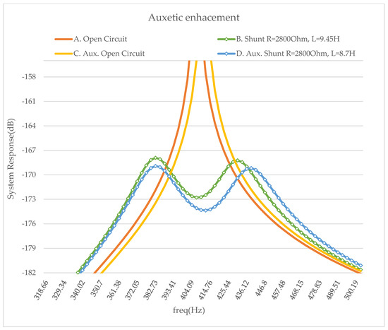 Additionally, Figure 8 shows that the use of a resonant shunt without any resistance creates antiresonance behavior when the inductance is tuned to its optimal value. In particular, it is the same case as before with an extra electric condition.