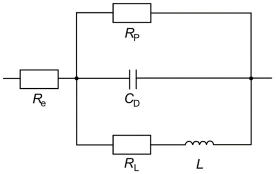 In the equivalent circuit, is the resistance of the electrolyte. In serial connection to there is another electrical circuit that describes the anodic oxide layer formation through a parallel arrangement of three electrical components: the polarization resistance , which includes both the resistance of the barrier and the diffusion resistance of the pore channels, the double-layer capacity , and a serial arrangement of the resistance as well as the inductor . According to the literature, the inductive behavior can be explained by the relaxation of charge-carrying defects [18].