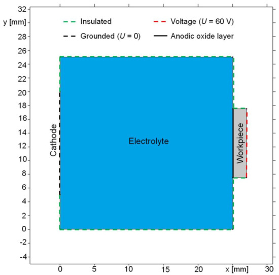 The model consists of a workpiece (colored as the grey area) with an anodic oxide layer (bold black line) and connected to an anodic potential of 60 V. The cathode’s surface (black dashed line) with a potential of 0 V and the electric conductivity of AISI 4340 is arranged vertically in parallel to the workpiece surface with a horizontal distance of 25 mm. The cathode’s vertical dimension was set to 15 mm and the anode’s vertical dimension to 15 mm according to the experiment described in Section 2.3. The electrolyte (blue-colored area) realizes the electrical contact between the workpiece and the cathode. The material parameters were the same as in the model described in Section 2.3. The simulation time was set to 30 min in analogy to the experiment.
