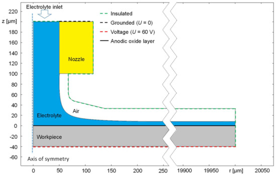 In order to describe the potential- and time-dependent anodic oxide formation in jet-based anodization, another model was created according to the geometrical arrangement and the electrical parameters of the respective experimental setup. The distribution of the flow of this model is based on the model described in [19]. The model, which is shown in Figure 3, contains a two-dimensional, rotation-symmetric geometry, where z indicates the vertical and r the radial dimensions.