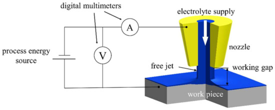 - Hackert-Oschätzchen, M.; Meichsner, G.; Zinecker, M.; Martin, A.; Schubert, A. Micro Machining with Continuous Electrolytic Free Jet. Precis. Eng. 2012, 36, 612–619. [Google Scholar] [CrossRef]