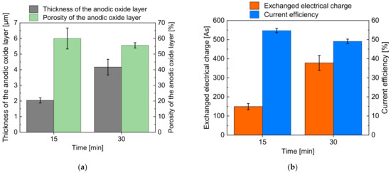 Figure 5a indicates an increase in thickness of the anodic oxidized layer from 2.0 µm after 15 min to 4.2 µm after 30 min. The detected porosity of the oxidized layer was 60% after 15 min and 55.6% after 30 min, which means an almost constant value regarding the measurement uncertainty highlighted by the error bars.
