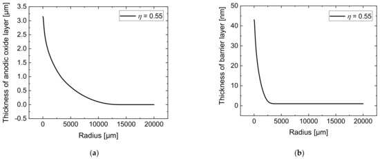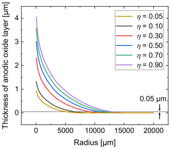 An increase in anodic oxide layer thickness can be seen with higher current efficiency. The radial trend of the layer thickness is an exponential decrease for all analyzed current efficiencies. At radii larger than 12,500 µm, a layer thickness of only 0.02 µm is achieved, independently of the analyzed current efficiency. Considering significant anodic formation that exceeds the barrier layer thickness and can therefore be defined with a minimal thickness of 0.05 µm, the lateral dimension depends on as highlighted by the horizontal line in Figure 8. While a current efficiency of = 0.90 results in a radial expansion of approximately 14,150 µm, only 6470 µm are achieved with = 0.05. Thus, the lateral expansion of the anodic oxide layer is significantly reduced at lower current efficiency.
