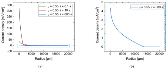 To describe the radial growth of the anodic oxide layer on the workpiece surface, the current density for a current efficiency of = 0.55 was calculated based on Equation (7) at various process times. The results are shown in Figure 7a as function of the radius. Figure 7b presents a detailed view of the current density distribution at = 600 s for a better visibility.