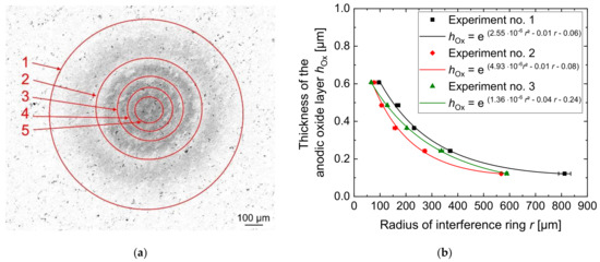 The measured radii of the interference rings are shown in Figure 9b. An exponential fit was used to illustrate the radial decrease in the anodic oxide layer thickness.