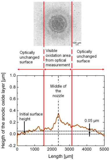 The current efficiency of jet-based anodization was calculated based on the tactile measurement results. For this purpose, the measured heights and the radii were used to calculate the volume of the anodic oxide grown outwards, which was considered a conical shape. The comparison between the optically measured thickness of the profile in Figure 9b and the tactilely measured profile in Figure 10 shows that the anodic oxide layer thickness at a defined distance from the center is about twice of the profile height. It follows that half of the anodic oxide layer has grown outward and half inward of the sample. For additional consideration of the anodic oxide grown in the inward direction, twice the conically shaped volume was calculated and defined as the experimental volume. The theoretical volume was calculated via Faraday’s law from the measured electric charge exchange under consideration of the density and porosity of the anodic oxide. The division of the experimental volume divided by the theoretical volume resulted in a current efficiency of 0.05.