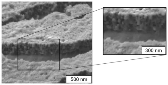 A SEM image of the fractured anodic oxide in close proximity to the fracture edge is shown in Figure 11.