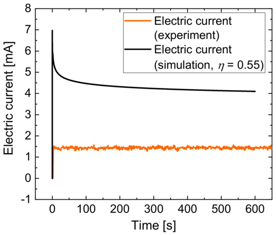 To validate the simulation model, the electric current developments over the process time of the simulation and the experiment for jet-based anodization were compared. Figure 12 shows the experimentally determined (orange line) and the calculated (black line) electric current characteristics. The simulated current achieved a maximum of 6.97 mA in the beginning of the process and a declining decrease to 4.1 mA at the end of the simulation, which was 600 s.