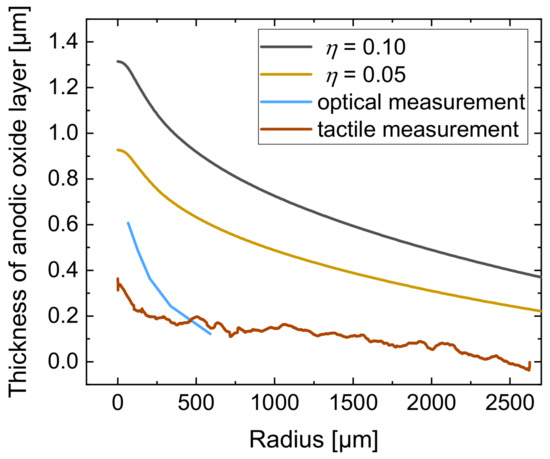 Comparison of the calculated anodic oxide thickness at = 0.10 (black line) and = 0.05 (yellow line) with the anodic oxide thickness from optical (blue line) and tactile (brown line) measurements as a function of the radius.