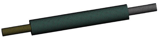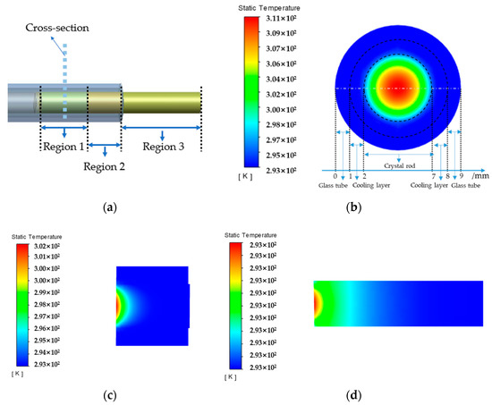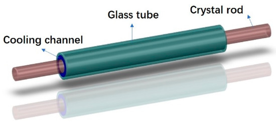 The fluid–structure interaction model with the glass tube, cooling channel, coolant and crystal rod is shown in Figure 1. The crystal rod and the glass tube are placed coaxially. The length of the crystal and the glass tube is 100 mm and 63 mm. The cooling channel is filled with coolant, which flows in from one end of the glass tube and out from the other end. Both ends are connected to the external structure modules to realize the circulation of coolant. Therefore, only the part of the rod inside the glass tube is cooled by the coolant, while the other part is placed in the air to install the fixed structure of the crystal rod. The convective heat transfer coefficient of air should be 1–10 W/m2/K [26], and here we use 6.5 W/m2/K according to the empirical value.