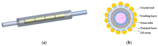 DPSSLs mainly adopt the technical scheme of “oscillation and amplification” to achieve high output power, which is called the master oscillator power amplifier (MOPA) system [9]. Oscillator technology is relatively mature; due to its low average power, the heat dissipation of the oscillator is sufficient. Therefore, effective heat dissipation of the amplifier is the key to achieving higher DPSSL output performance. At present, amplifiers in high-power DPSSL systems commonly use an LD side-pumped configuration, and the gain medium is a crystal rod or slab (rectangular prism) [10,11,12]. The configuration with multiple LD arrays side-pumped and using a crystal rod is relatively simple and reliable, providing high pumped LD energy, large aperture scalability and smooth pumped power distribution along the crystal length, so high average output power or pulse energy can be achieved [13,14]. However, the spatial and geometric structures of the side-pumped LD array and gain medium seriously affect the quality of the output beam [15]. Therefore, more attention must be paid to the configuration design process, especially the impact on thermal effects.
