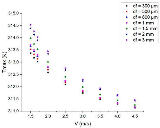 Figure 5 shows that with the increase in the coolant velocity, the maximum temperature under different cooling layer thicknesses is characterized by a continuous decrease. Therefore, high coolant velocity is helpful for effective heat dissipation of the crystal rod. At the same lower coolant velocity (V < 2.5 m/s), the larger the layer thickness, the higher the maximum temperature of the crystal rod. It can be noted that under the condition of constant low velocity, a larger cooling layer thickness with more coolant is not conductive enough to improve heat dissipation for the crystal rod. As V = 2.5 m/s, the maximum temperature is similar when the cooling layer thickness is 1 mm and 800 μm. When V > 2.5 m/s, some changing trends can be observed; the maximum temperature is closer when the cooling layer thickness is less than 1.5 mm or more than 1.5 mm. This means that in the case of high velocity, with df = 1.5 mm as the dividing line, when the cooling layer thickness is above or below 1.5 mm, the influence of the cooling layer thickness on the maximum temperature can be ignored. Therefore, at high coolant velocity, it is not necessary to choose a particularly small or large cooling layer thickness in order to obtain better heat dissipation performance, and their differences are less than 0.5 K.