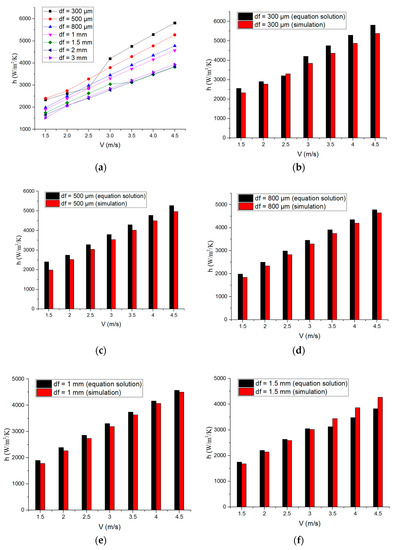 Convective heat transfer coefficient results. (a) Equation solution; (b) the comparison results for df = 300 μm; (c) the comparison results for df = 500 μm; (d) the comparison results for df = 800 μm; (e) the comparison results for df = 1 mm; (f) the comparison results for df = 1.5 mm; (g) the comparison results for df = 2 mm; (h) the comparison results for df = 3 mm.