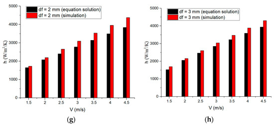 The solution results of the convective heat transfer coefficient according to Equation (7) are shown in Figure 8a. The results indicate that under different cooling layer thicknesses, the convective heat transfer coefficient increases with the increase in coolant velocity. Because of the different Reynolds number ranges, the curves are correspondingly different. For df = 300 μm, the convective heat transfer coefficient has a great increase from V = 2.5 m/s to V = 3 m/s. For df = 1.5 mm, the convective heat transfer coefficient has a slight rise from V = 3 m/s to V = 3.5 m/s. For df > 1 mm, convective heat transfer coefficients become similar at V > 3 m/s. Comparative results of simulation and equation solutions are shown in Figure 8b–h. It can be found that when df < 1.5 mm, the equation solution commonly demonstrates higher values than the simulation result, while when df > 1.5 mm, it is the opposite. The deviation between them is mostly within 10%, so in direct solid thermodynamic simulation of a crystal rod, the solution value of Equation (7) could be used as a reference for the selection of the convective heat transfer coefficient.