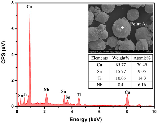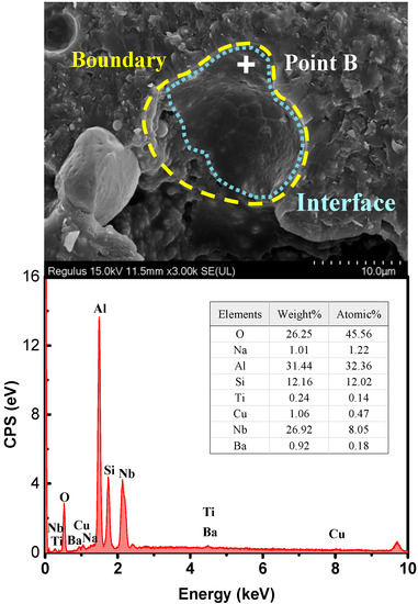 Figure 10 shows the morphology and EDS result of the crater left by the TC particle. The yellow dashed line was the outline of the original alloy particle, and the blue-grey area referred to the interface between the original alloy particle and the matrix. From the EDS result for point B, the elemental mass ratio of Ti to Cu (WTi/Cu% = 22.64%) was higher than that of the un-sintered alloy particle (WTi/Cu% = 15.29%, in Figure 1). In summary, the diffusion coefficient of Ti and Cu were 7.82 × 10−11 and 6.98 × 10−11 cm2/s (950 °C), respectively. Although the actual starting content of Ti was lower than that of Cu, the diffusion of Ti is still greater than that of Cu during interfacial diffusion, which was consistent with the calculation of the diffusion coefficient, which indicated that Ti diffused better than Cu in the matrix.