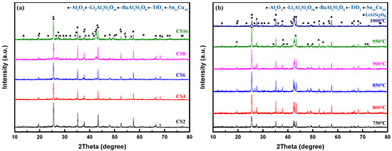 Figure 2a illustrates the XRD patterns of the TC composites with different TC contents sintered at 950 °C for 1 h. The crystallization phase of the TC composites consisted of α-Al2O3 (PDF#: 74-1081), Li2Al2Si3O10 (PDF#: 73-2335), BaAl2Si2O8 (PDF#: 74-0177), TiO2 (PDF#: 87-0710), and Sn11Cu39 (PDF#: 71-0122). Figure 2b illustrates the XRD patterns of the TC composites with 16 wt% TC content sintered from 750 to 1000 °C for 1 h. Similar to the results in Figure 2a, Li2Al2Si3O10 appeared in samples at all sintering temperatures, except for LiAlSi2O6 (PDF#:73-2336) which appeared in the sample sintered at 1000 °C. When the sintering temperature was 1000 °C, the viscosity of the glass-ceramic decreased, the material migrated sufficiently and the precipitation of SiO2 increased, so that LiAlSi2O6 (Li2O·Al2O3·4SiO2, high quart solid solute) was therefore produced instead of Li2Al2Si3O10 (Li2O·Al2O3·3SiO2). Combining with Figure 2a, it can be seen that the diffraction intensity of TiO2 (2θ = 27.44º) sintered at 800 °C was much higher than that of TiO2 sintered at 750 °C, and increased with TC content, which indicated that TiO2 formed at about 800 °C. The diffraction peak intensity of Li2Al2Si3O10 at 2θ = 25.51º sintered at 800 °C was therefore much higher than that sintered at 750 °C, due to TiO2 acting as a nucleating agent to promote the crystallization of Li2Al2Si3O10.