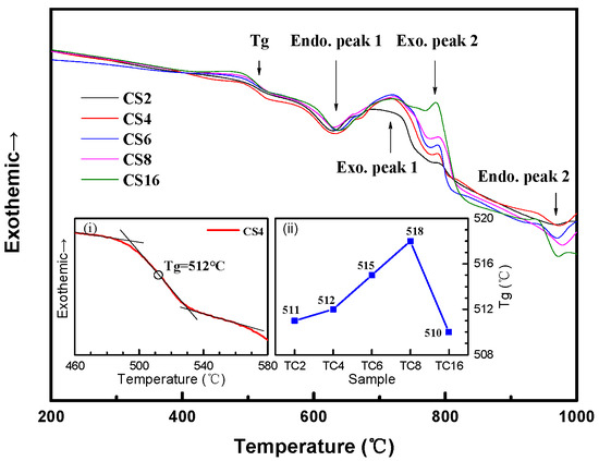 In order to verify the physical and chemical changes during sintering, the DSC curves of TC composites with different TC alloy contents are measured at a heating rate of 10 °C/min from 30 to 1000 °C, as shown in Figure 3. The endothermic peak 1 at about 630 °C referred to the liquefaction process of the matrix, which was a sign of liquid phase sintering. The exothermic peak 1 at the range of 680–750 °C corresponded to the precipitation of BaAl2Si2O8 and Li2Al2Si3O10 and showed an increase in the relative intensity with the increasing of TC content, due to the increased TiO2 formation, which promoted the precipitation of Li2Al2Si3O10. The exothermic peak 2 at about 785 °C became more apparent with the increasing TC content and corresponded to the formation of TiO2. The endothermic peak 2 at about 950 °C was believed to be correlated to the melting process of TC powder. The endothermic process at about 490–530 °C corresponded to the glass transition process. The midpoint of the DSC curve shifting to an endothermic direction was selected as the glass transition temperature, as shown in the insert figure (i). The Tg value increased from 511 to 518 °C and then decreased to 510 °C with the increase in TC content (insert figure (ii)). This is consistent with the research of Węgrzyk et.al [25]. As the basic constituent elements of vitrified bond, boron has two functional units in vitrified bond, [BO3] triangle units and [BO4] tetrahedrons, which affect the network structure, sintering behavior, and physical properties of the vitrified bond. XPS is therefore conducted to verify changes in the functional units of boron in TC0/ and TC4/CBN composites.