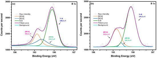Figure 4 shows the XPS spectrum of B 1s for the TC0/ and TC4/CBN composites sintered at 950 °C for 1 h. The characteristic peaks of [BO4], [BO3], and the N–B bond were observed at 192.6, 191.9 [36], and 190.3 [37] eV, respectively. The N–B bond refers to CBN. Comparing Figure 4a,b demonstrated that the proportion of [BO3] triangle units decreases with the increase of [BO4] tetrahedrons, which can be explained by the fact that Cu2+ ions in the TC affected the coordination number of boron and promoted the conversion from [BO3] to [BO4] groups by entering the vitrified bond network. At the same time, as an intermediate cation, Ti4+ ions enter the vitrified bond network, connect the non-bridged oxygen to build [TiO4] tetrahedrons, increase the connection of the vitrified bond network structure, break Si–O–Si and Si–O–Al connections, partly replace Al3+ and Si4+ from [AlO4] and [SiO4] [7], resulting in a more compact network structure. All of these contributed to an increase in the network dimensionality and connectivity, resulting in a more compact and rigid glass network, which could explain Tg values increased with TC content increased from 2 to 8 wt%. However, when the TC content reached 16 wt%, the excess Cu2+ and Ti4+ entered the vitrified bond network structure, as a network modifier leading to a loose network structure and reducing the Tg values. Therefore, it is suggested that TC alloy promoted the conversion of [BO3] to [BO4] units, thus affecting the structure of the vitrified bond and the glass transition process of the TC composites.